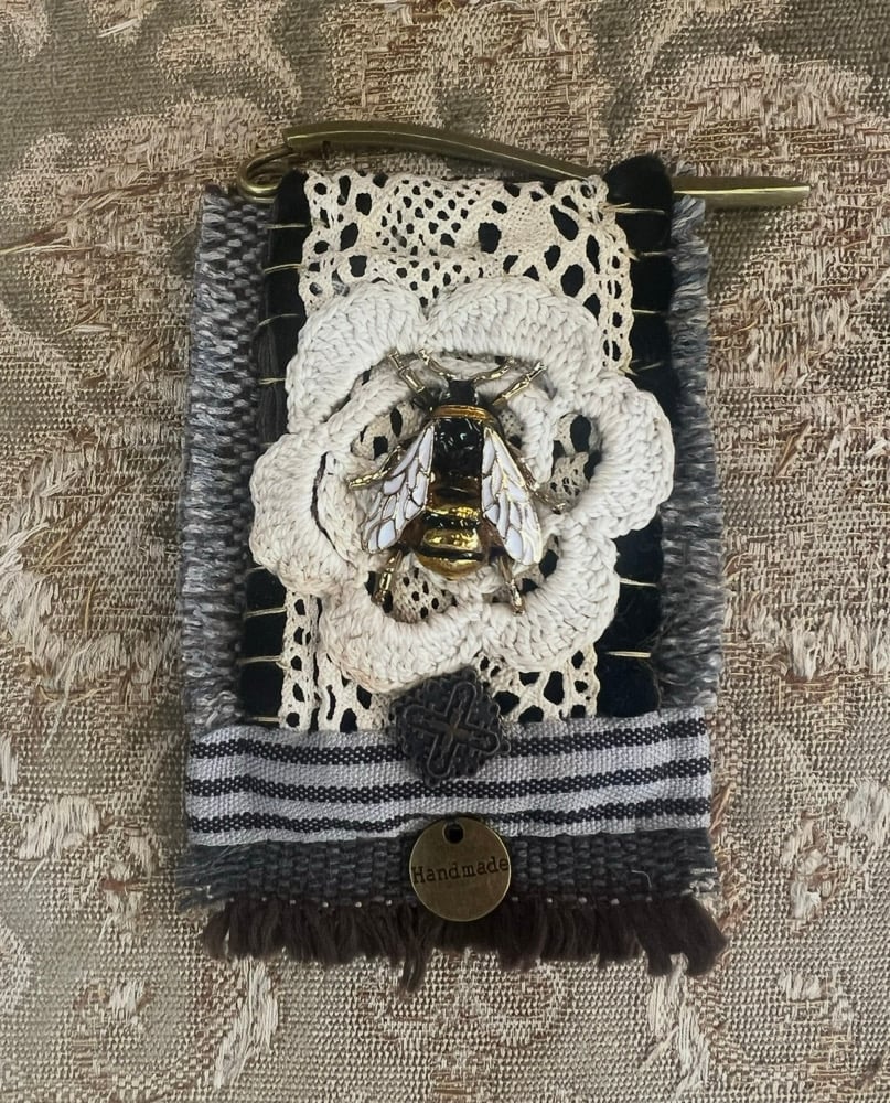 Handstitched brooch using old French textile fragments, decorative metal pieces and attached to a pin.