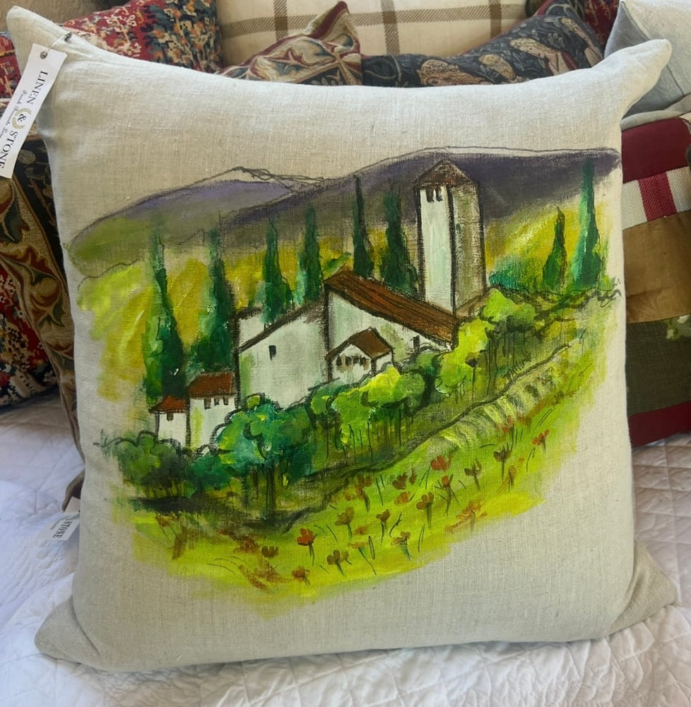Handpainted Italian scene on linen cushion and filled with a feather inner. Measures 50 x 50cm